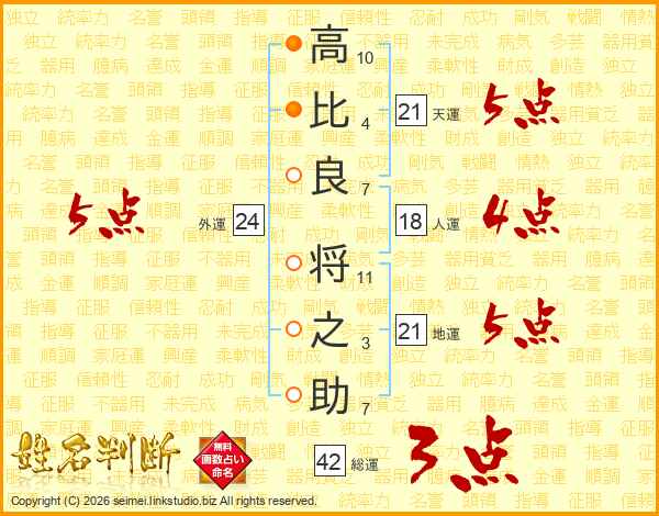 高(10画)比(4画)良(7画) 将(11画)之(3画)助(7画)
