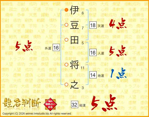 伊豆田将之さんの総運は32画の5点!