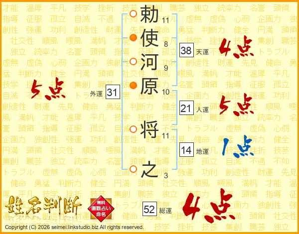 勅(11画)使(8画)河(9画)原(10画) 将(11画)之(3画)