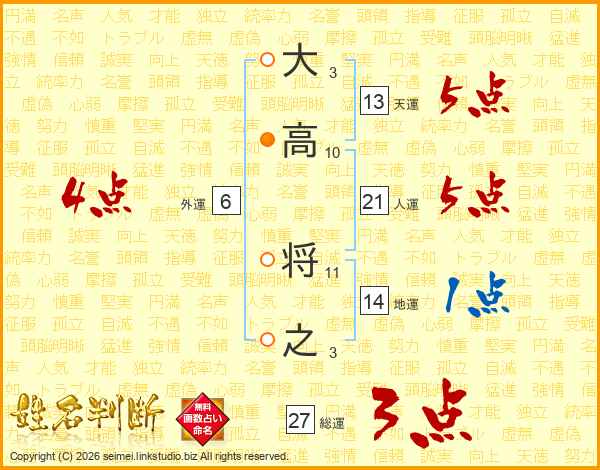 大高将之さんの総運は27画の3点!