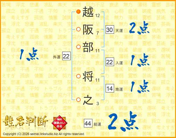 越(12画)阪(7画)部(11画) 将(11画)之(3画)