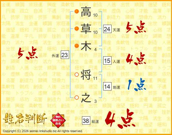 生活面を象徴する運勢です。外部から受ける影響力を表し、結婚運、家庭運や職場、環境への順応性を表します。総運から人運を引いた画数。姓や名が1文字の場合を除く。