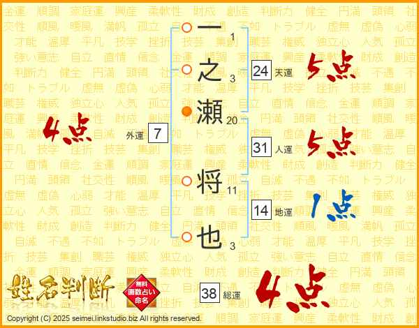一(1画)之(3画)瀬(20画) 将(11画)也(3画)