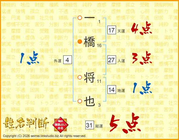 一橋将也さんの総運は31画の5点!