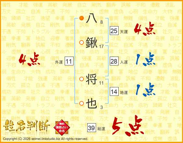 あなたの人生を表す1番重要な運勢です。生涯を通じて影響する総合運となり、主に50歳以降の晩年期に影響を及ぼします。苗字と名前の合計画数。