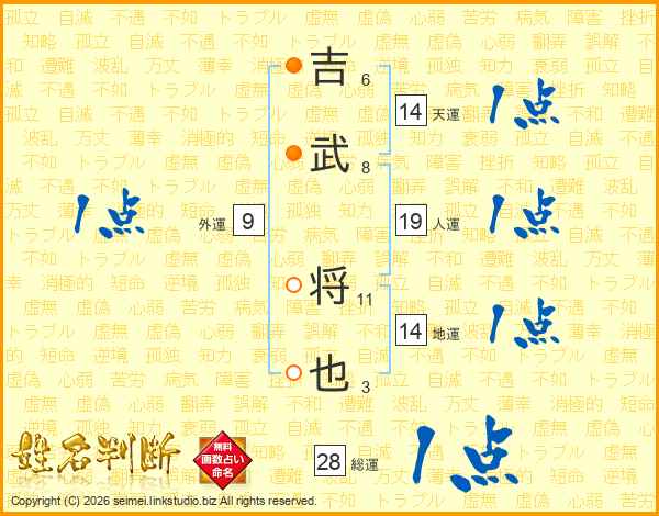 生活面を象徴する運勢です。外部から受ける影響力を表し、結婚運、家庭運や職場、環境への順応性を表します。総運から人運を引いた画数。姓や名が1文字の場合を除く。