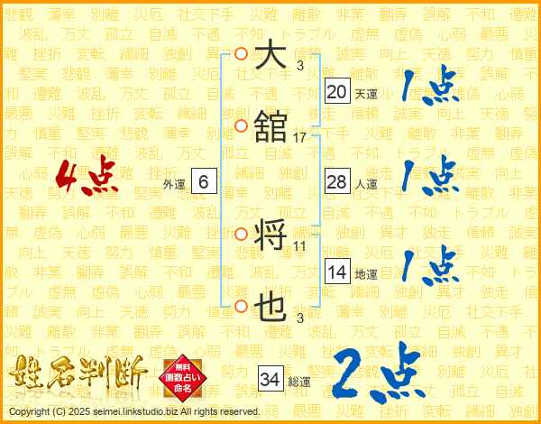 あなたの人生を表す1番重要な運勢です。生涯を通じて影響する総合運となり、主に50歳以降の晩年期に影響を及ぼします。苗字と名前の合計画数。