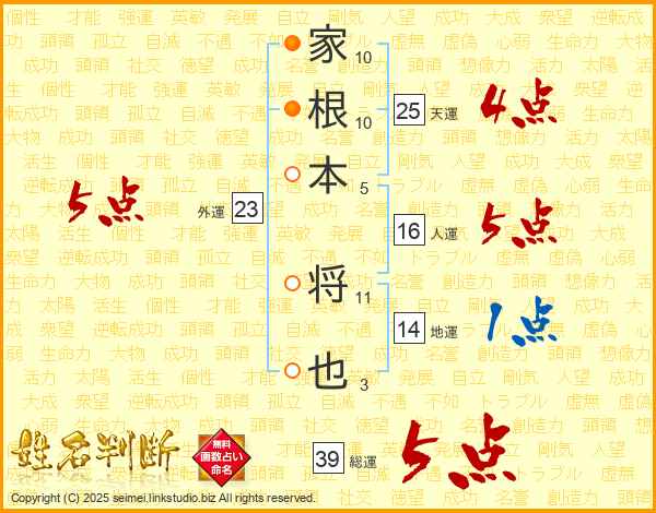 家系が持つ宿命的な運勢を表します。祖先から受け継いだ苗字ですので自分の力が及びません。家柄を象徴します。苗字の合計画数。