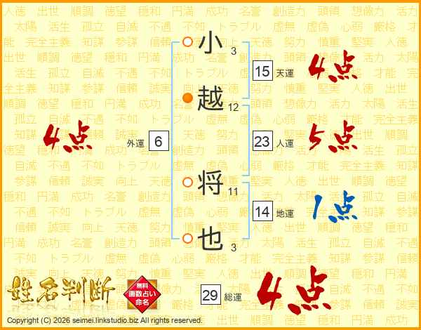 小越将也さんの総運は29画の4点!