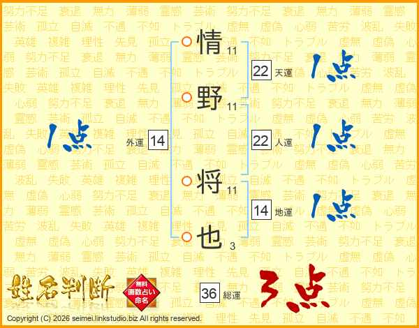 あなたの人生を表す1番重要な運勢です。生涯を通じて影響する総合運となり、主に50歳以降の晩年期に影響を及ぼします。苗字と名前の合計画数。