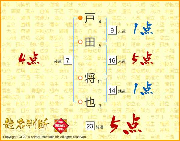 戸田将也さんの総運は23画の5点!