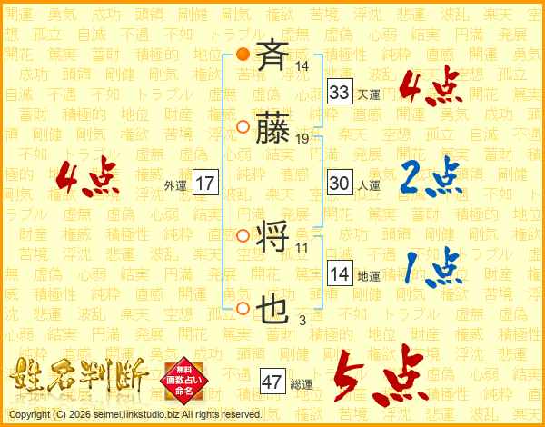 斉(14画)藤(19画) 将(11画)也(3画)