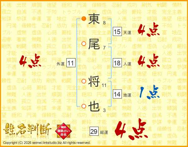 東尾将也さんの総運は29画の4点!