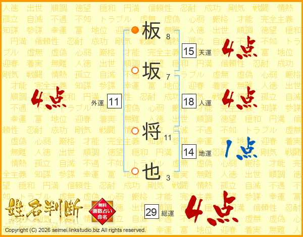 板坂将也さんの総運は29画の4点!