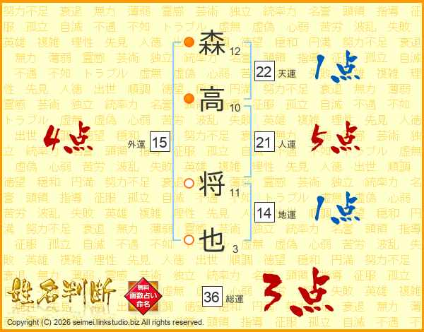 あなたの人生を表す1番重要な運勢です。生涯を通じて影響する総合運となり、主に50歳以降の晩年期に影響を及ぼします。苗字と名前の合計画数。
