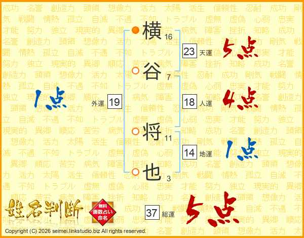 横谷将也さんの総運は37画の5点!