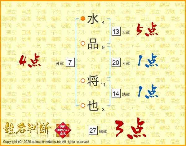 生活面を象徴する運勢です。外部から受ける影響力を表し、結婚運、家庭運や職場、環境への順応性を表します。総運から人運を引いた画数。姓や名が1文字の場合を除く。