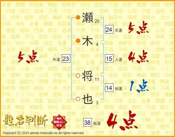 瀬木将也さんの総運は38画の4点!