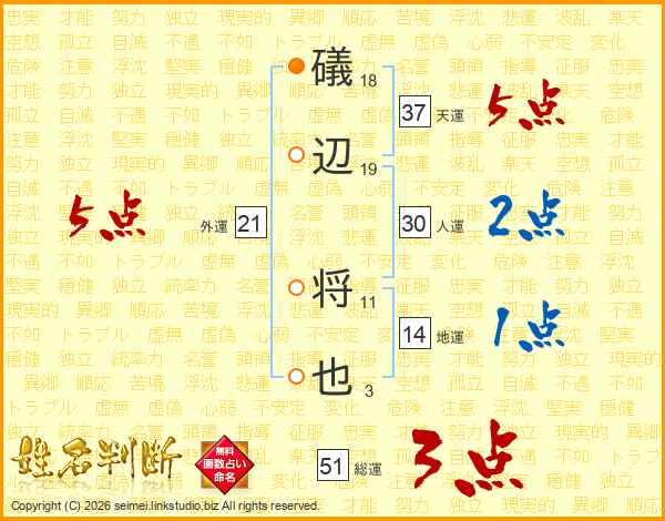 生活面を象徴する運勢です。外部から受ける影響力を表し、結婚運、家庭運や職場、環境への順応性を表します。総運から人運を引いた画数。姓や名が1文字の場合を除く。