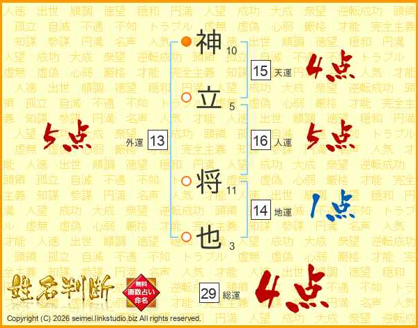 生活面を象徴する運勢です。外部から受ける影響力を表し、結婚運、家庭運や職場、環境への順応性を表します。総運から人運を引いた画数。姓や名が1文字の場合を除く。