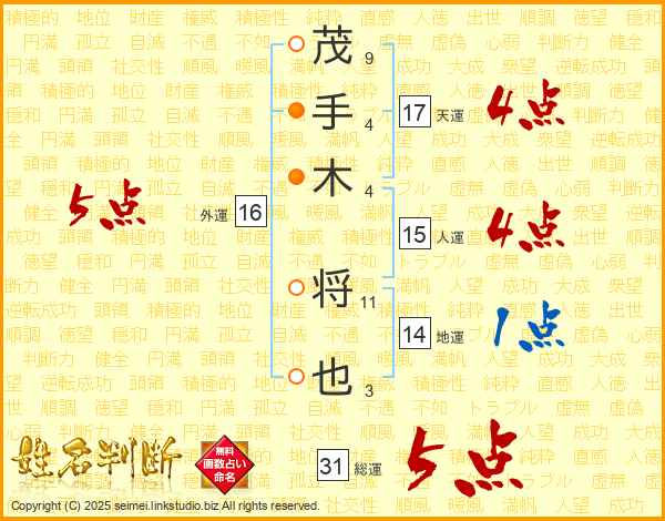 茂手木将也さんの総運は31画の5点!