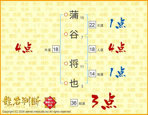 蒲谷将也さんの総運は36画の3点!