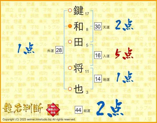 鍵和田将也さんの総運は44画の2点!