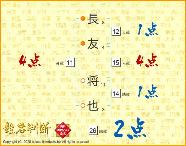 長友将也さんの総運は26画の2点!