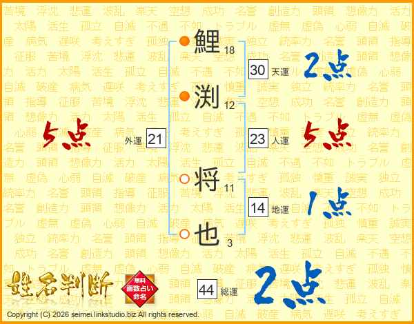 鯉(18画)渕(12画) 将(11画)也(3画)
