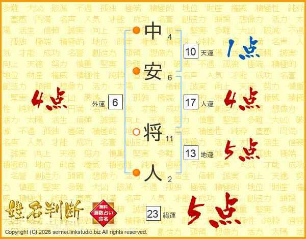生活面を象徴する運勢です。外部から受ける影響力を表し、結婚運、家庭運や職場、環境への順応性を表します。総運から人運を引いた画数。姓や名が1文字の場合を除く。