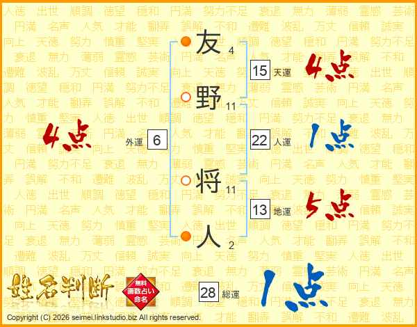 生活面を象徴する運勢です。外部から受ける影響力を表し、結婚運、家庭運や職場、環境への順応性を表します。総運から人運を引いた画数。姓や名が1文字の場合を除く。