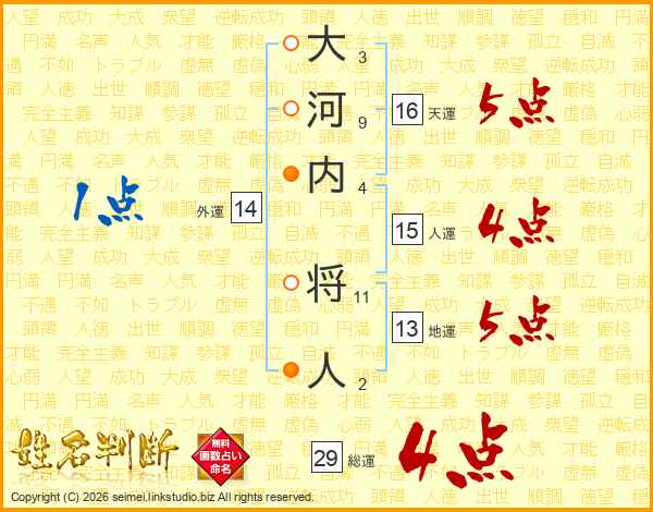 大河内将人さんの総運は29画の4点!