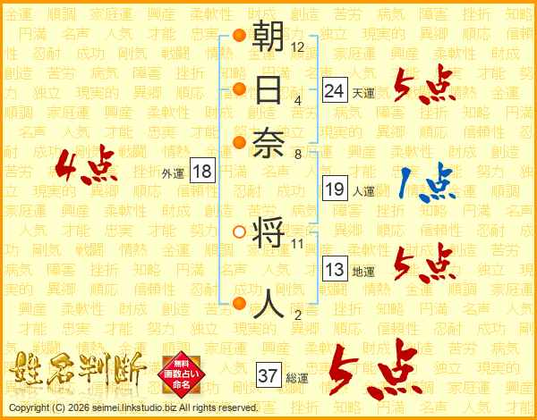 朝日奈将人さんの総運は37画の5点!