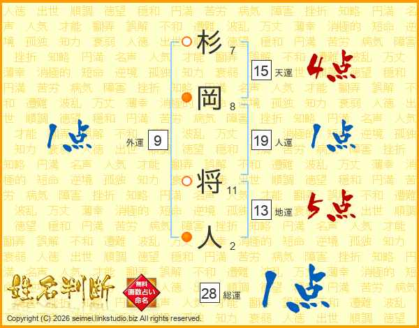 あなたの人生を表す1番重要な運勢です。生涯を通じて影響する総合運となり、主に50歳以降の晩年期に影響を及ぼします。苗字と名前の合計画数。