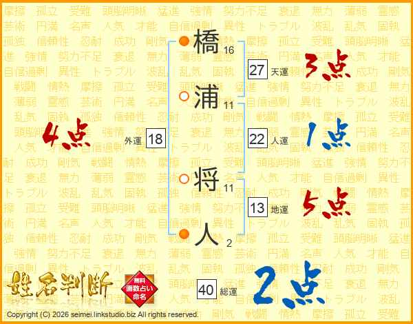 橋浦将人さんの総運は40画の2点!