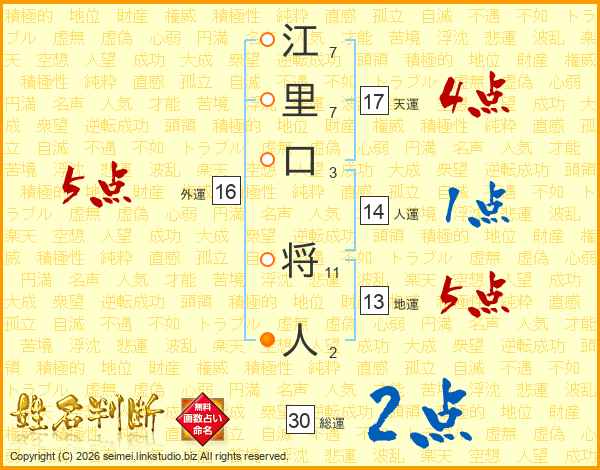 生活面を象徴する運勢です。外部から受ける影響力を表し、結婚運、家庭運や職場、環境への順応性を表します。総運から人運を引いた画数。姓や名が1文字の場合を除く。