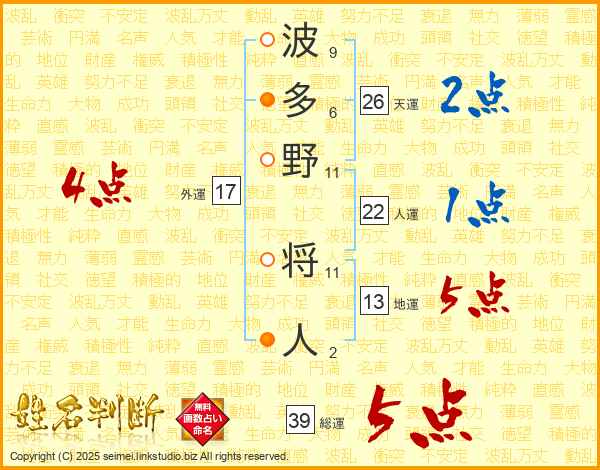 波(9画)多(6画)野(11画) 将(11画)人(2画)