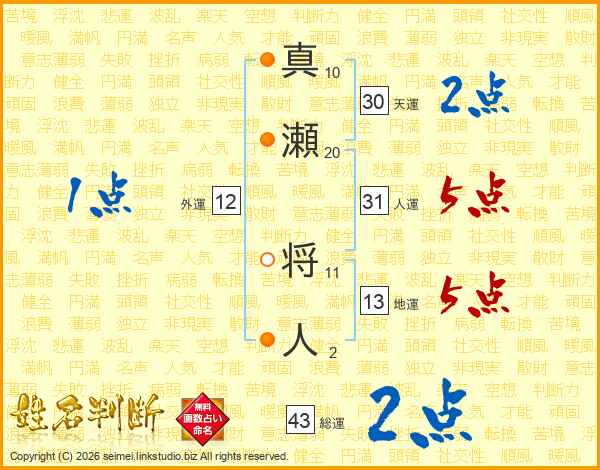 真瀬将人さんの総運は43画の2点!