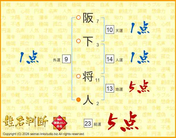 阪下将人さんの総運は23画の5点!