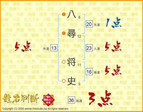 あなたの人生を表す1番重要な運勢です。生涯を通じて影響する総合運となり、主に50歳以降の晩年期に影響を及ぼします。苗字と名前の合計画数。
