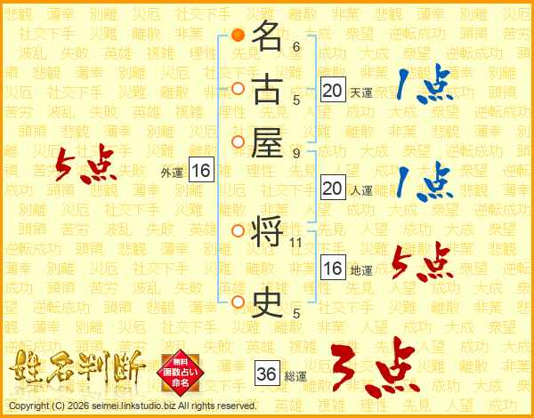 名(6画)古(5画)屋(9画) 将(11画)史(5画)