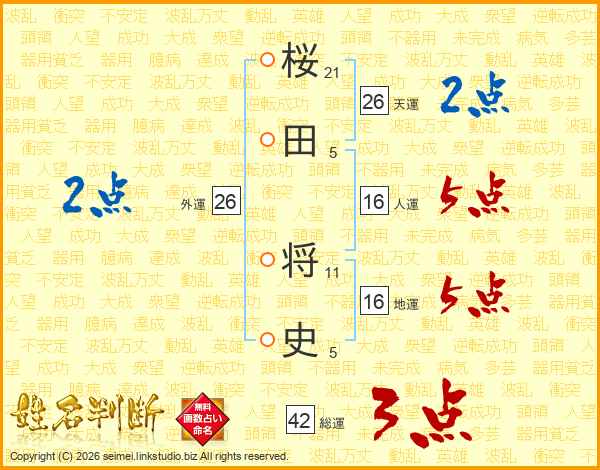 桜田将史さんの天運は26画の2点!