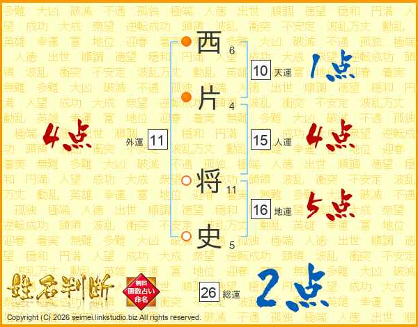 家系が持つ宿命的な運勢を表します。祖先から受け継いだ苗字ですので自分の力が及びません。家柄を象徴します。苗字の合計画数。