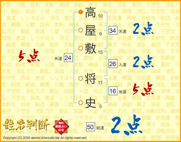 高(10画)屋(9画)敷(15画) 将(11画)史(5画)