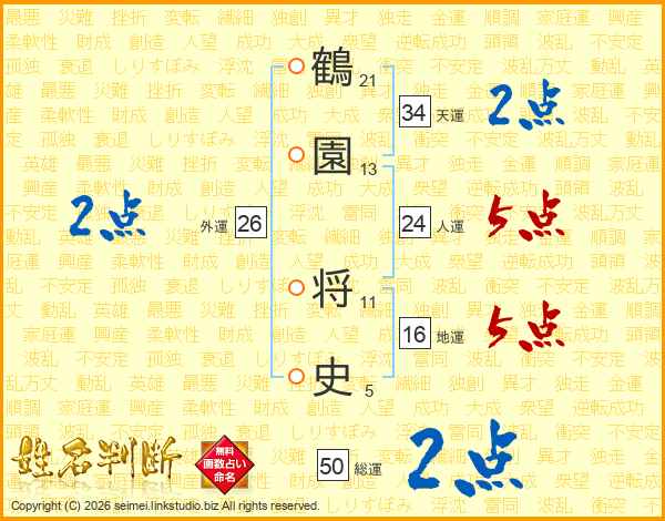 あなたの人生を表す1番重要な運勢です。生涯を通じて影響する総合運となり、主に50歳以降の晩年期に影響を及ぼします。苗字と名前の合計画数。