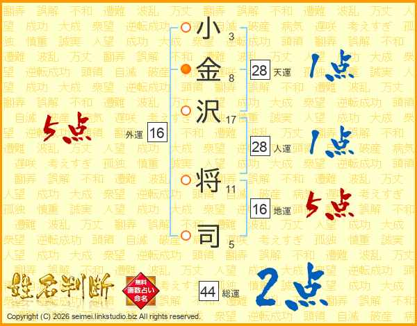 小(3画)金(8画)沢(17画) 将(11画)司(5画)