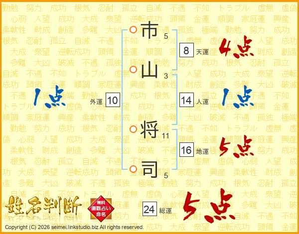 あなたの人生を表す1番重要な運勢です。生涯を通じて影響する総合運となり、主に50歳以降の晩年期に影響を及ぼします。苗字と名前の合計画数。