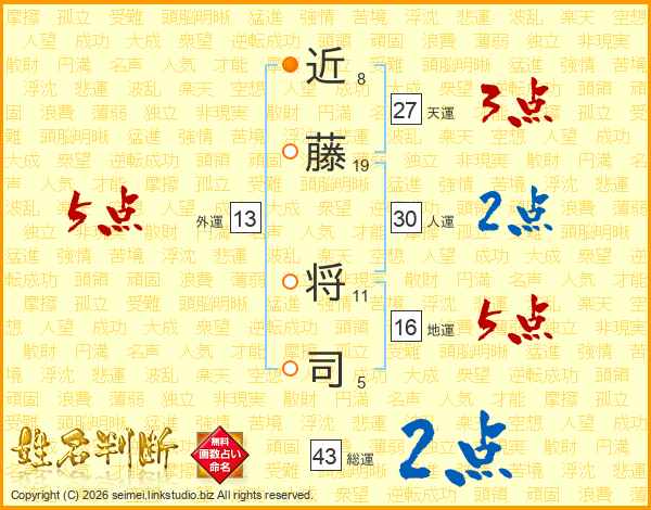 あなたの人生を表す1番重要な運勢です。生涯を通じて影響する総合運となり、主に50歳以降の晩年期に影響を及ぼします。苗字と名前の合計画数。