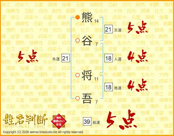 熊谷将吾さんの総運は39画の5点!