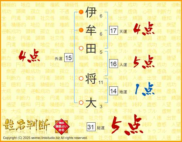 伊(6画)牟(6画)田(5画) 将(11画)大(3画)